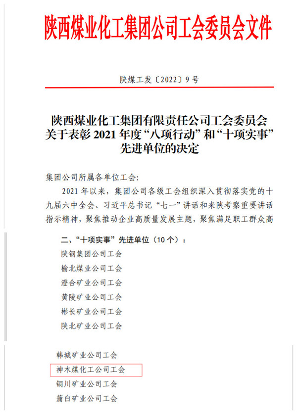 神木煤化工公司工會榮獲陜煤集團公司工會2021 年度“十項實事”先進單位