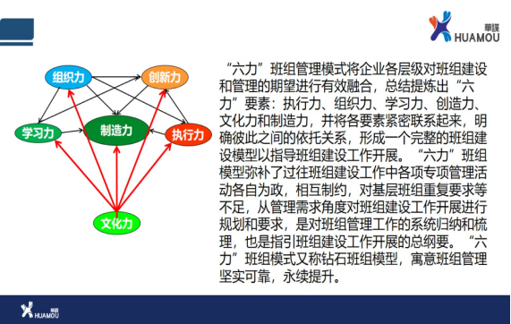 “六力”班組管理模式將企業(yè)各層級(jí)對(duì)班組建設(shè)和管理的期望進(jìn)行有效融合,總結(jié)提煉出“六力”要素:執(zhí)行力、組織力、學(xué)習(xí)力、創(chuàng)造力、文化力和制造力,并將各要素緊密聯(lián)系起來(lái),明確彼此之間的依托關(guān)系,形成一個(gè)完整的班組建設(shè)模型,以指導(dǎo)班組建設(shè)工作開(kāi)展。