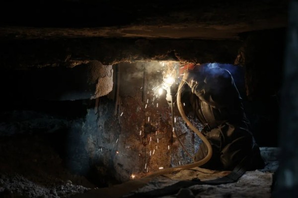 在大修現(xiàn)場有一群耀眼的背影,他們一手握著面罩,一手拿著焊槍,蜷縮在狹窄的空間里作業(yè),時而跪焊,時而側焊,一干就是幾個小時,經常跪到手腳發(fā)麻也毫無怨言,他們就是電化公司的焊工師傅們。